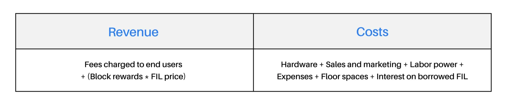 In terms of costs, SPs have many factors to consider: purchasing and maintaining performant hardware setups, optimizing sales and marketing operations, power consumption, as well as other expenses and interest payments on borrowed FIL when applicable. Some of these, such as hardware setups and power consumption, can be negotiated.